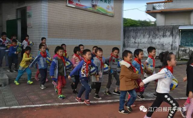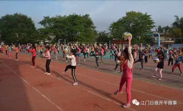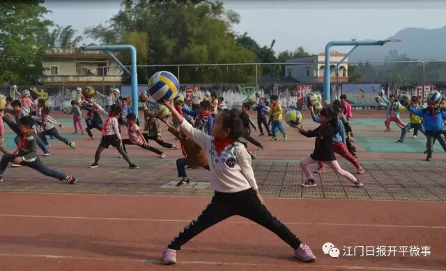 “鈴鈴鈴……”下午3:50,下課的鐘聲響起來,瞬間,一大群小朋友從各個班級里走出來,人手抱著一個排球,腳下邁著有力步伐,嘴里喊著“一,一,一二一”整齊地往運動場集合。這不是哪所體育學(xué)校的訓(xùn)練,只是開平市赤坎鎮(zhèn)江南小學(xué)日常大課間中的一幕。這所位于開平和臺山交界的農(nóng)村小學(xué),目前在校學(xué)生只有197人,卻在今年江門市第八屆運動會排球比賽中,奪得小學(xué)男子組第一名。