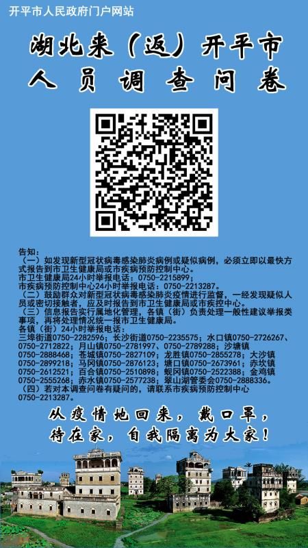 針對(duì)確診病例主要是輸入性,為保障全體市民和來(lái)開(kāi)平人員的生命安全和身體健康,根據(jù)省重大突發(fā)公共衛(wèi)生事件一級(jí)響應(yīng)要求,現(xiàn)將健康自查申報(bào)有關(guān)事項(xiàng)通告如下: 一、請(qǐng)自1月22日起(含當(dāng)日)從疫情源發(fā)地省份回來(lái),或者有接觸疫情源發(fā)地省份人員,或者接觸確診、疑似病例者,或者出現(xiàn)發(fā)熱(37.3攝氏度及以上)、咳嗽、呼吸急促等不適癥狀的開(kāi)平市民和來(lái)開(kāi)平人員,向戶籍地(居住地)的村(居)委會(huì)申報(bào)登記本人近14天內(nèi)的健康狀況,并認(rèn)真填寫《湖北來(lái)(返)開(kāi)平人員調(diào)查問(wèn)卷》。 二、如果市民發(fā)現(xiàn)近期身邊有人從疫情源發(fā)地省份回來(lái),或者有接觸疫情源發(fā)地省份人員,或者接觸確診、疑似病例者,請(qǐng)?zhí)嵝阉麄冎鲃?dòng)登記。歡迎市民提供有關(guān)疫情線索,市衛(wèi)生健康局24小時(shí)電話:0750-2215899;市疾病預(yù)防控制中心24小時(shí)電話:0750-2213287。各鎮(zhèn)(街)、管委會(huì)24小時(shí)電話附后。如出現(xiàn)發(fā)熱(37.3攝氏度及以上)、咳嗽、呼吸急促等不適癥狀時(shí),應(yīng)督促他們及時(shí)佩戴口罩,到就近的發(fā)熱門診就診。 三、各部門和各鎮(zhèn)(街)、管委會(huì)、村(居)委會(huì)以及物業(yè)小區(qū)、出租業(yè)主要主動(dòng)壓實(shí)責(zé)任,對(duì)從疫情源發(fā)地省份回來(lái),或者有接觸疫情源發(fā)地省份人員,或者接觸確診、疑似病例者等人群進(jìn)行大排查,督促相關(guān)人員做好健康申報(bào)和監(jiān)測(cè),發(fā)動(dòng)群眾對(duì)居家隔離人員進(jìn)行社會(huì)監(jiān)督,全面落實(shí)“防輸入、防擴(kuò)散、防蔓延”措施。四、請(qǐng)市民遵守疫情防控要求,主動(dòng)配合做好健康申報(bào)、隔離觀察、追蹤排查等工作,對(duì)刻意隱瞞、拒不配合造成后果的,將依法追究法律責(zé)任。各鎮(zhèn)(街)、管委會(huì)24小時(shí)疫情線索電話:水口鎮(zhèn)0750-2726267、0750-2712822 本通告自發(fā)布之日起施行,終止日期另行通告。