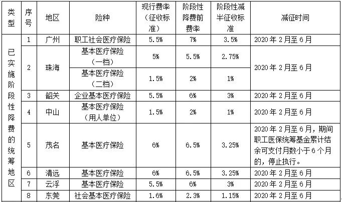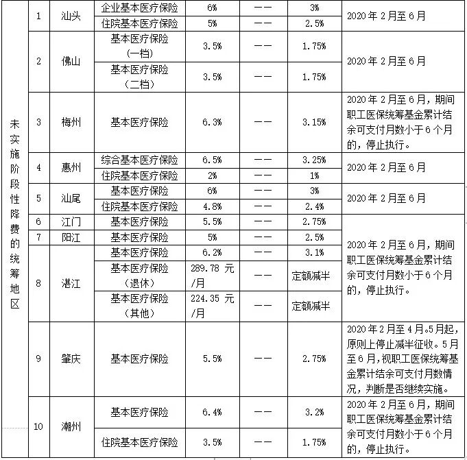 不是。職工醫(yī)保統(tǒng)籌基金累計(jì)結(jié)余可支付月數(shù)大于6個(gè)月的統(tǒng)籌地區(qū),執(zhí)行減半征收職工基本醫(yī)療保險(xiǎn)單位繳費(fèi)政策。執(zhí)行起始月份都是2020年2月,但是終止月份取決于各市職工醫(yī)保統(tǒng)籌基金累計(jì)結(jié)余情況,可支付月數(shù)小于6個(gè)月的,停止執(zhí)行該政策。省醫(yī)保、省稅務(wù)聯(lián)合印發(fā)的《關(guān)于進(jìn)一步明確階段性減征職工基本醫(yī)療保險(xiǎn)費(fèi)有關(guān)意見的通知》(粵醫(yī)保函〔2020〕62號(hào))規(guī)定,各市要在3月9日前制定本地的貫徹措施,各市政策明確后,廣東稅務(wù)將及時(shí)做好宣傳。
