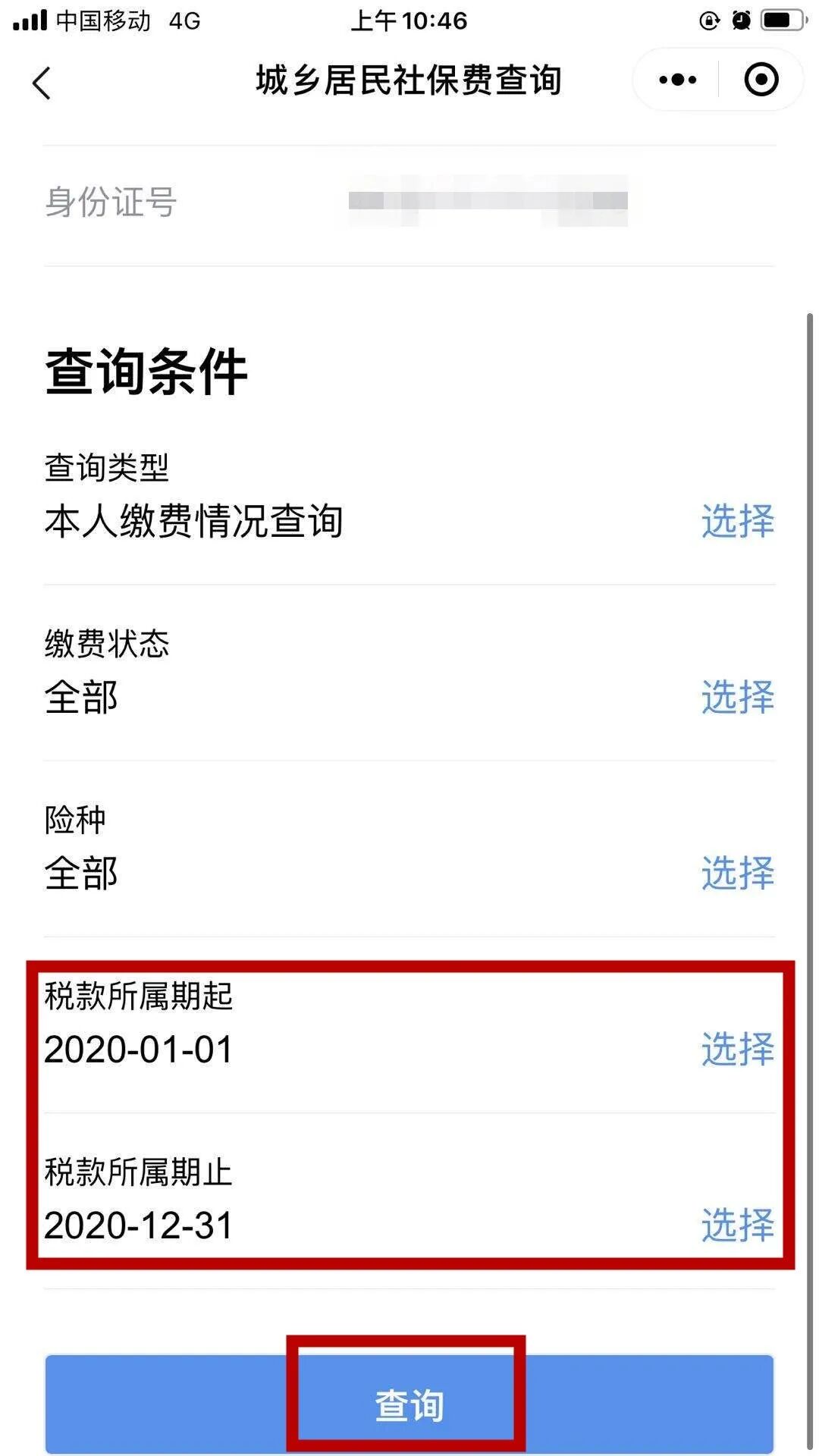 認(rèn)證完成后,點擊【城鄉(xiāng)居民社保】,選擇【城鄉(xiāng)居民社保費查詢】,選擇險種、所屬期起止日期,即可查詢。