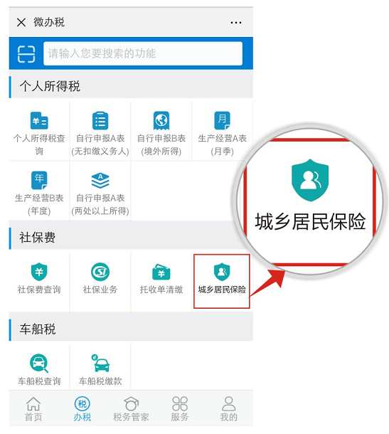 然后選擇“【微辦稅】--【個人業(yè)務(wù)】--【城鄉(xiāng)居民保險】--【城鄉(xiāng)居民保險清繳】。