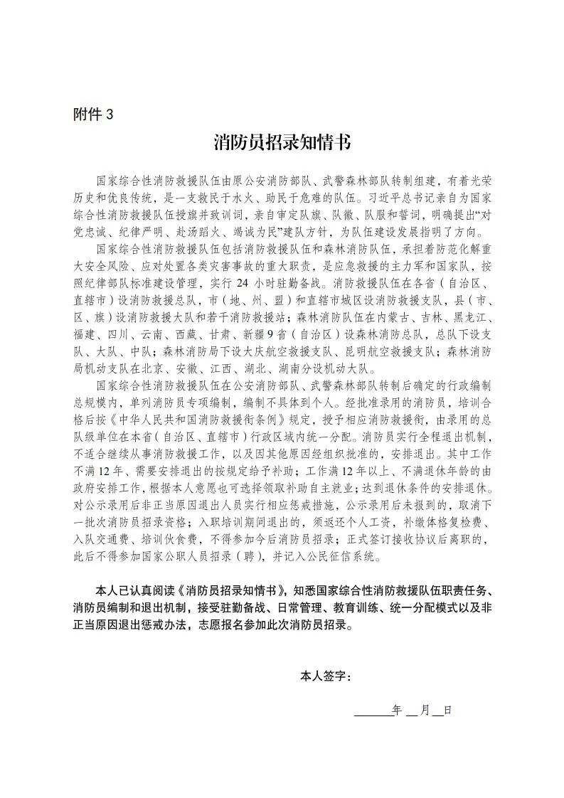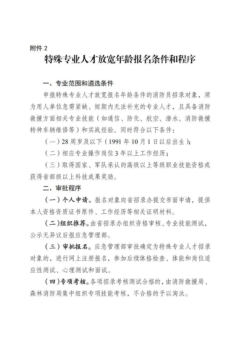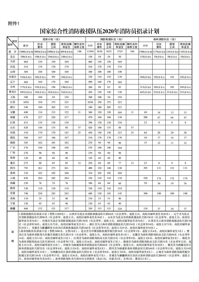 為有效履行防范化解重大安全風險、應對處置各類災害事故的職責使命,根據《國家綜合性消防救援隊伍消防員招錄辦法(試行)》(人社部規(guī)〔2018〕5號)等法規(guī)政策,現(xiàn)就國家綜合性消防救援隊伍2020年面向社會招錄消防員相關事項公告如下:經應急管理部、人力資源社會保障部批準,此次國家綜合性消防救援隊伍共招錄消防員15000名,其中:公開招錄社會青年5000名、定向招錄退役士兵5000名、專項招錄高校應屆畢業(yè)生4894名、專項招錄原公安消防部隊解約定向培養(yǎng)士官106名。具體招錄計劃見附件1。(二)遵守憲法和法律,擁護中國共產黨領導和社會主義制度;(四)年齡為18周歲以上、24周歲以下(出生日期在1995年10月1日至2002年9月30日之間),大學本科以上學歷人員年齡放寬至26周歲(1993年10月1日以后出生),對消防救援工作急需的特殊專業(yè)人才,經應急管理部批準年齡可放寬至28周歲(1991年10月1日以后出生);(八)法律、法規(guī)規(guī)定的其他條件。定向招錄退役士兵須為解放軍或武警部隊服役期滿退役士兵(含國家綜合性消防救援隊伍工作期滿退出消防員),以作戰(zhàn)部隊退役義務兵為主;專項招錄高校應屆畢業(yè)生須為參加全國普通高等學校(含研究生培養(yǎng)單位)招生統(tǒng)一考試,取得全日制大學專科以上學歷和相應學位的2020年應屆畢業(yè)生;專項招錄原公安消防部隊解約定向培養(yǎng)士官須為所依托院校2020年應屆畢業(yè)生。國家統(tǒng)一招生的2018年、2019年普通高等學校畢業(yè)生離校時和擇業(yè)期內(國家規(guī)定擇業(yè)期為兩年)未落實工作單位,其戶口、檔案、組織關系仍保留在原畢業(yè)學校,或保留在各級畢業(yè)生就業(yè)主管部門(畢業(yè)生就業(yè)指導服務中心)、各級人才交流服務機構和各級公共就業(yè)服務機構的畢業(yè)生,可按高校應屆畢業(yè)生對待。消防員招錄采用網上報名的方式,資格審查采取網上初審、現(xiàn)場復核的方式進行。(一)網上注冊報名。招錄對象可在2020年7月20日23時后、9月30日18時前登錄國家綜合性消防救援隊伍消防員招錄平臺(http://xfyzl.119.gov.cn),查詢?yōu)g覽招錄信息,注冊進入消防員招錄在線報名系統(tǒng)。申請?zhí)厥鈱I(yè)人才放寬年齡報名的,由本人于9月10日前(以信件寄出郵戳時間為準)向省級消防員招錄工作辦公室(以下簡稱“省級招錄辦”)寄送書面申請和相關證件證書復印件,經省級招錄辦組織審核、公示并報應急管理部審批同意后,辦理網上注冊報名。標準條件和辦理程序見附件2。網上報名時,招錄對象須填報個人信息進行賬號注冊和實名認證。登錄成功后,按照類別選擇“社會青年”、“退役士兵”、“高校應屆畢業(yè)生”、“解約定向培養(yǎng)士官”報名通道。退役士兵招錄對象不得隱瞞服役經歷選擇“社會青年”或“高校應屆畢業(yè)生”報名,一經發(fā)現(xiàn)取消招錄資格;解約定向培養(yǎng)士官直接進入專項報名通道,僅限報考生源地省份消防救援隊伍。具有全日制大學??埔陨蠈W歷的招錄對象須填寫所學專業(yè)及專業(yè)代碼(可在國家綜合消防救援隊伍消防員招錄平臺“通知公告”欄查詢)。招錄對象登錄在線報名系統(tǒng)前,須仔細閱讀《報名指南》和《報名須知》,按系統(tǒng)提示錄入報考意向、調劑志愿、學歷經歷、表彰獎勵等信息,并上傳證件照片和居住證、退伍證等圖片。報名證件照片包括本人近期1寸免冠正面彩色照片(須為藍色或白色背景,295×413像素,jpg或jpeg格式)和身份證照片(橫向拍攝身份證正、反面照片,身份證須整體處于居中位置,不留邊框,確保清晰,jpg或jpeg格式),證件照片需經系統(tǒng)工具處理符合要求后方可上傳。提供虛假報名信息的,取消招錄資格。招錄對象須憑注冊的身份證號碼和密碼打印準考證,查詢招錄進度,請務必牢記。報名時,招錄對象可按照個人意向選擇在戶籍地省份或經常居住地省份報名。在戶籍所在地省份報名的,可根據招錄計劃選擇報考意向;持居住證在經常居住地省份報名的,只可報考當?shù)叵谰仍犖榛蛏窒狸犖?。報名意向欄設有調劑選項,如選擇服從調劑,可按個人意向在“同省跨隊伍”(志愿在本省的消防救援隊伍和森林消防隊伍間進行調劑)、“同隊伍跨省”(志愿在所選隊伍全國范圍內進行調劑)、“跨省跨隊伍”(志愿在全國范圍內的兩支隊伍間進行調劑)選項中進行選擇。服從調劑人員錄取幾率更高。招錄對象也可到國家綜合性消防救援隊伍各支隊、大隊、消防救援站(中隊),領取宣傳資料,現(xiàn)場上網填寫報名信息。(二)網上初審。網上報名期間,各省級招錄辦同步對招錄對象報名信息進行初審。網上初審通過后,報名信息原則上不得修改。確需修改的,須由本人在報名系統(tǒng)中提出申請、說明事由,經省級招錄辦審批,修改信息后重新提交審核。報名信息不完整、初審未通過的招錄對象,可在報名系統(tǒng)中補充信息后重新提交審核。初審發(fā)現(xiàn)不符合條件范圍的招錄對象,可在報名系統(tǒng)中提出修改信息申請,詳細說明修改事由,報省級招錄辦審核、應急管理部審批,修改報名信息后重新提交審核。修改報名信息僅限申請1次,須于9月20日前申報,9月21日0時起不再受理。(三)參加資格審查現(xiàn)場復核。招錄對象根據網上初審結果,按省級招錄辦通知要求,由本人